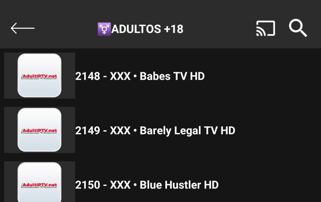 Toda a lista de canais adultos protegido com senha para bloqueio e segurança das crianças.